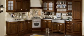 The use of corner cabinets successfully plays up the space, rounding the room at the top, creating the impression of spaciousness and comfort.