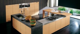 A tier with a niche for placing a microwave oven is made about 35-38 cm high with an open lower shelf, the depth of which is also 35 cm. Such a niche can be combined with a hanging section or represent a separate module. The shelf width is from 56 cm. The hood is installed 80 cm above the gas stove and 70 cm from the electric surface. Hanging the hood higher reduces the speed and efficiency of its operation; low placement affects the duration of operation of the equipment: the hood may break due to overheating.