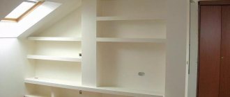 It should be remembered that drywall itself is not strong enough to support significant weight. If the composition of shelves and closed cells is quite solid and takes up a lot of space in height and width, the plasterboard elements are supplemented with a frame made of profiles. Reinforcement of the structure with stiffening ribs is encouraged.