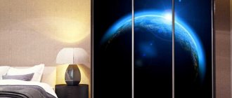 The design of our three-door wardrobe suggests the presence of one door with a solid mirror sheet, and two doors with a matte mirror separated by lintels. You will need to inform the furniture makers that the doors should be divided into four equal parts, and they will independently calculate the size of the inserts and the number of lintels.