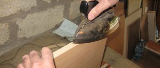 We cut the doors out of a 400 mm wide panel and do fittings - the doors should cover the middle shelf. We cut off the corners on top of the doors and sand them with a machine until smooth transitions between the sides are formed. We drill three holes for hinges on each sash. We install hinges and fasten the doors.