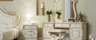 - Configuration - for a large room, a group with two bedside tables is suitable, but for a small room it is better to prefer a console, a wall-mounted model with a folding tabletop, or a small table with a sliding drawer.