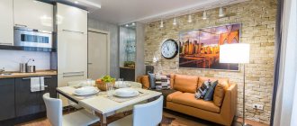A kitchen with a sofa of this model is very convenient, since a tired housewife can lie down for a while while dinner is being prepared in the oven. In addition, couches can serve as a sleeping place for guests. Significant disadvantages are that the upholstery of the sofa often absorbs the smell of food and gets very dirty.