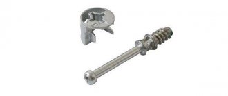 | Стяжка коническая. Стремление спрятать головку винта с лицевой поверхности привело к модернизации стяжки «бочонок». В результате винт, проходящий насквозьчерез присоединяемую деталь собираемого каркаса мебели, был заменен штоком, вворачиваемым в корпус с резьбовым отверстием, завинченную или впрессованную заподлицо в пласть детали. |