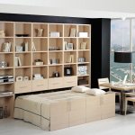 - Еще один вариант, позволяющий экономить пространство, – откидная кровать. В сложенном виде конструкция располагается вертикально, заподлицо с фасадом шкафа или стеллажа. Такую модель по достоинству оценят подростки. К минусам можно отнести неизбежный износ механизма трансформации, сложность использования для детей младшего возраста.
